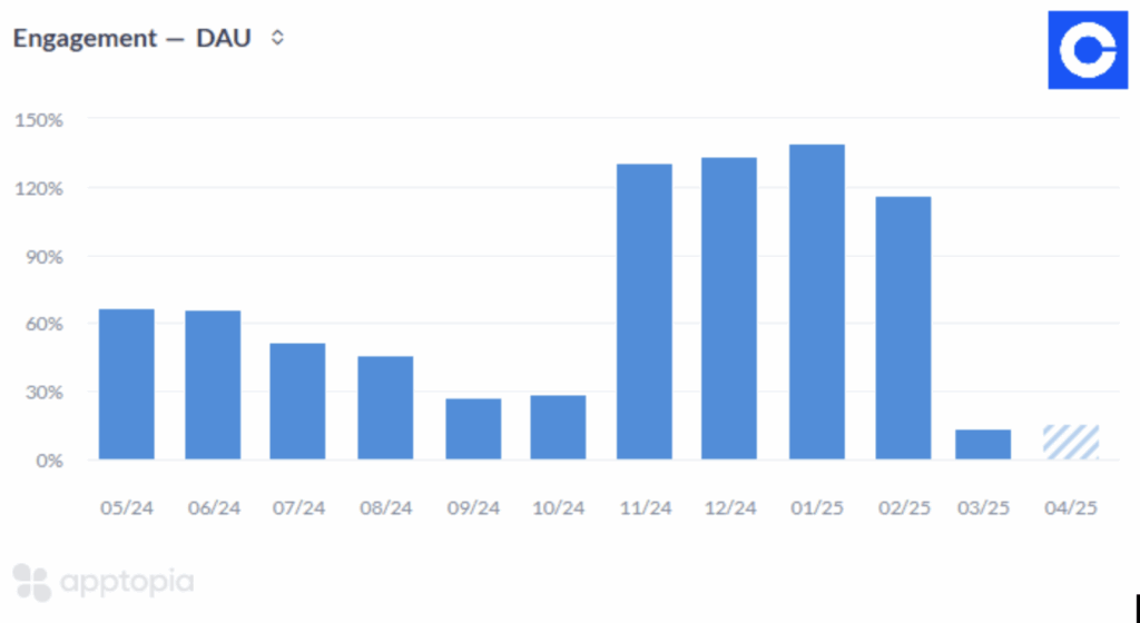Our research suggests that the YoY growth in our DAU metric captures the YoY growth trend in COIN’s reported Consumer Trading Volume. While March did show a significant slowdown, January and February saw very strong YoY growth in DAUs. Meanwhile, April’s DAU growth remains positive through the first three weeks. Our view is that 1Q25 growth is trending higher than the market expects.