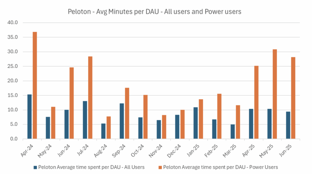 Apptopia’s MPI for Peloton shows better-than-expected YoY change in subscribers. Indeed, the data suggests that the decline became less bad in 2Q25, while the market expects the trend of YoY declines to continue to worsen. The ray of light is coming from user engagement, as all users spent more time on the app in 2Q25 than they have in months, and power users also spent way more time on the app. For power users, the time spent on average these past three months was higher than every month back to July 2024 and April 2024. People want that beach body!