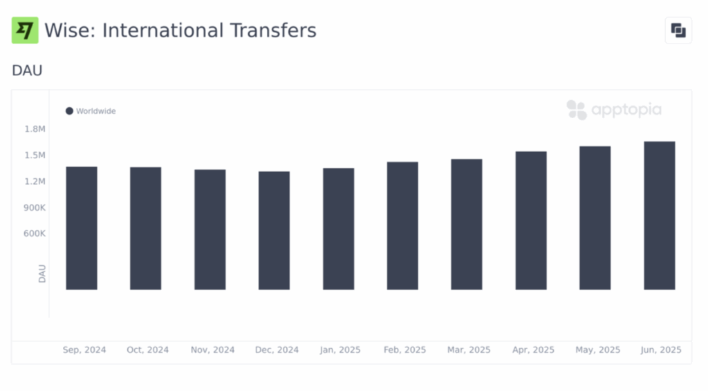 Apptopia’s MPI for Wise suggests a positive inflection in the YoY growth rate for Customers, which has been positive but declining for at least two years. The chart below demonstrates how DAUs, which started declining from September 2024, have grown sequentially each month in 2025, and began making new highs again in 2Q25.