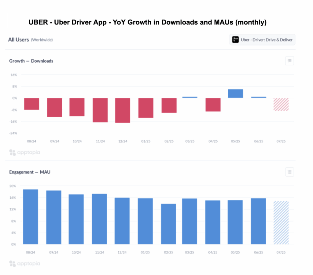 Our newly released MPI for Uber suggests that the deceleration expected by consensus for the YoY growth of Trips is too negative. There are a number of metrics that show improvement for Uber, but two we always like to look at for Uber are downloads and MAUs of the Driver app. The chart below shows how during 2Q25, the YoY growth of both metrics started to turn positive relative to 1Q25.