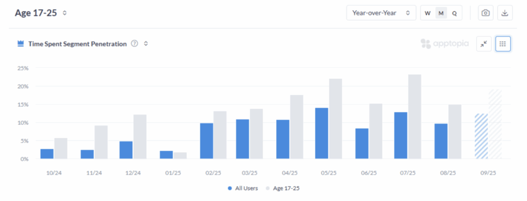 META – Instagram Minutes per DAU YoY Growth – Ages 17-25 vs All Users(monthly)