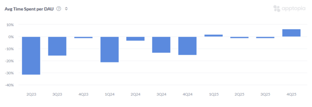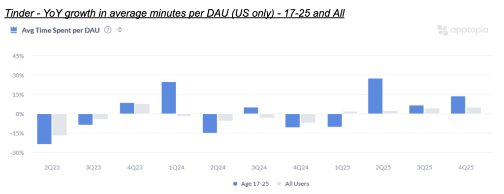 More interesting, however, is the improvement in user engagement in Gen Z. Tinder saw Gen Z users increase their average time spent per day by 14% YoY in 4Q25 compared with 5% for all users of Tinder.