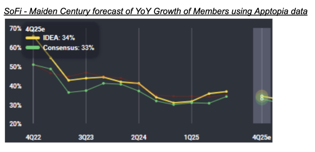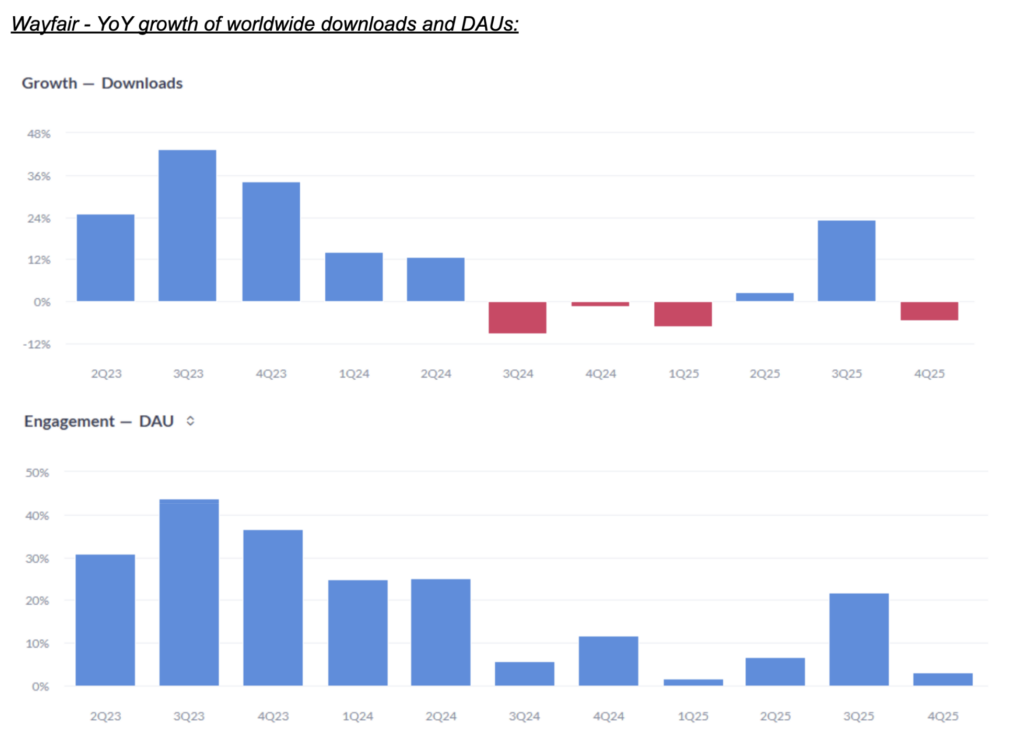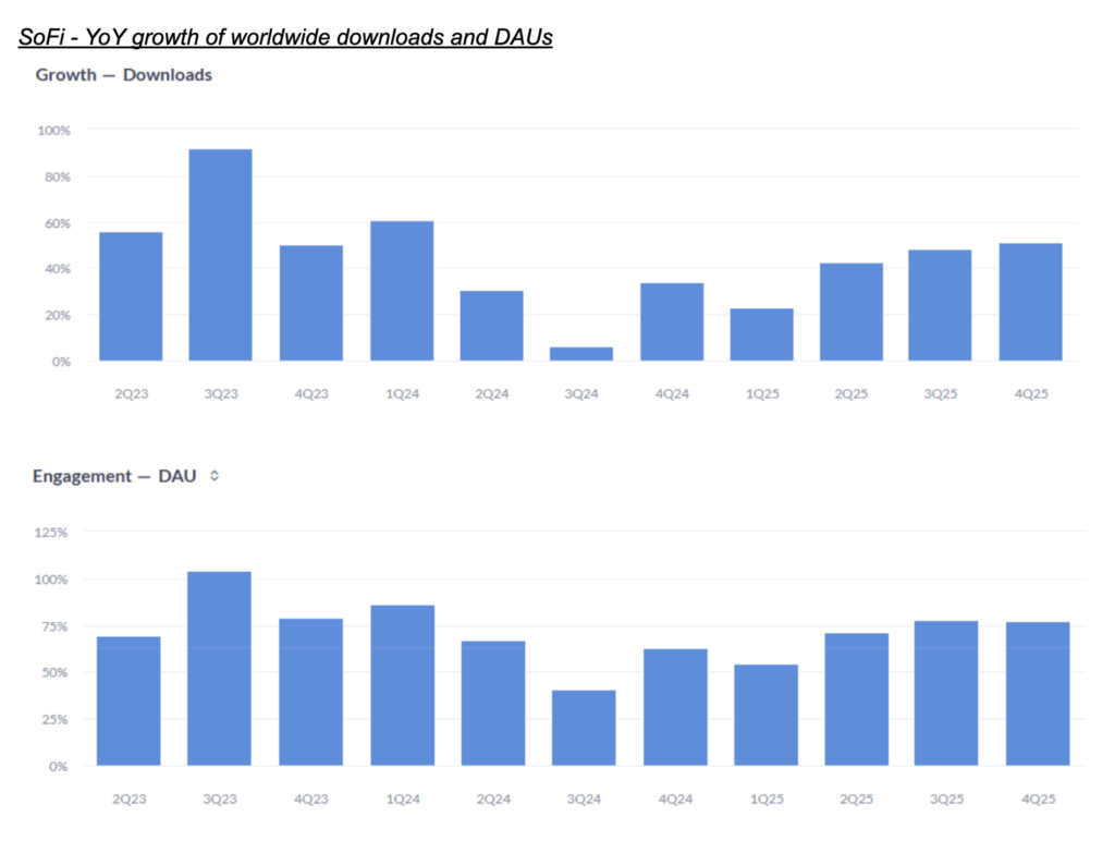 SOFI: We previewed a strong quarter for SOFI a month ago. While DAU growth cooled slightly at the end of the quarter, leading to a slight deceleration in DAU growth in 4Q25, downloads growth showed another quarter of acceleration: