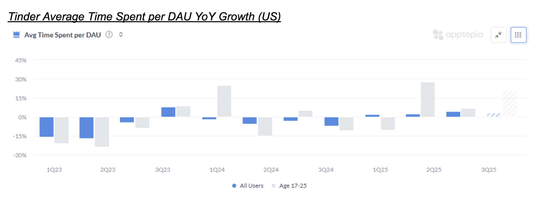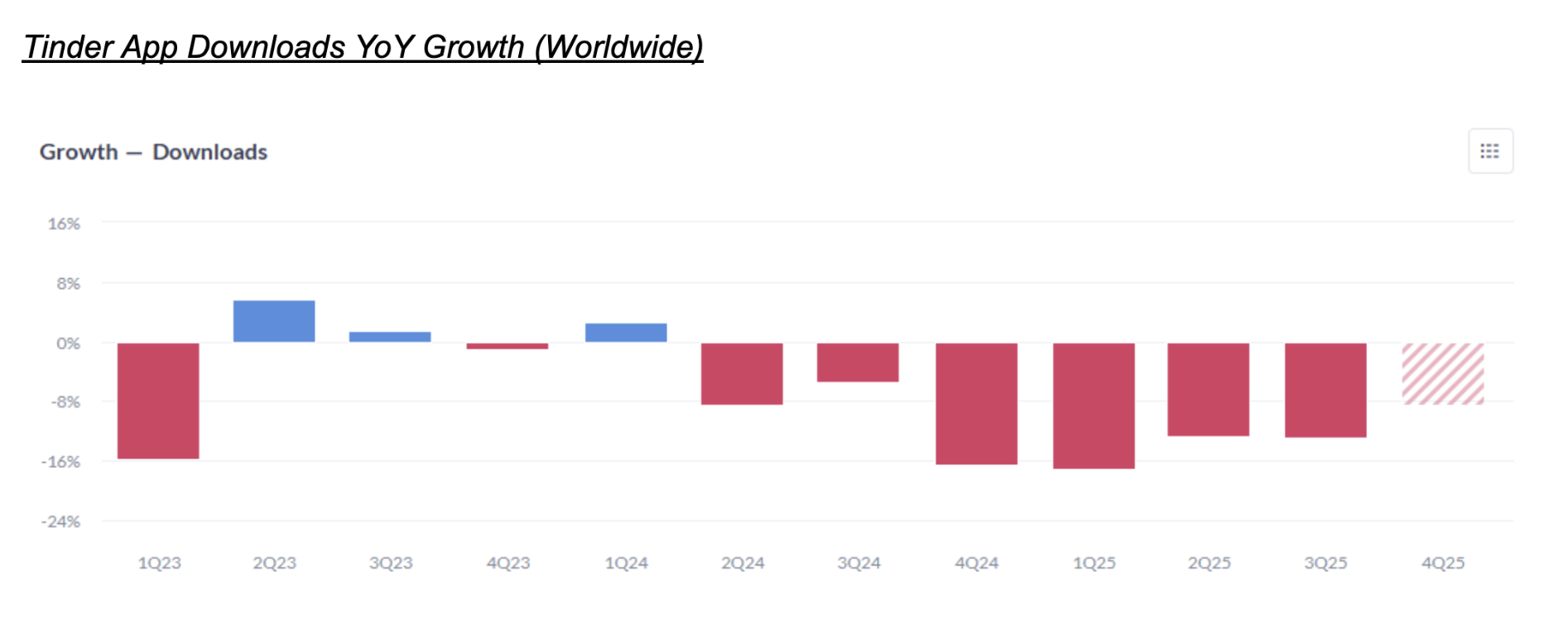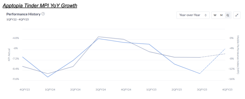 Our data, when combined into our Mobile Performance Index (MPI) for Tinder, suggests a better YoY growth rate than what Consensus expects for Tinder Payers in 4Q25: