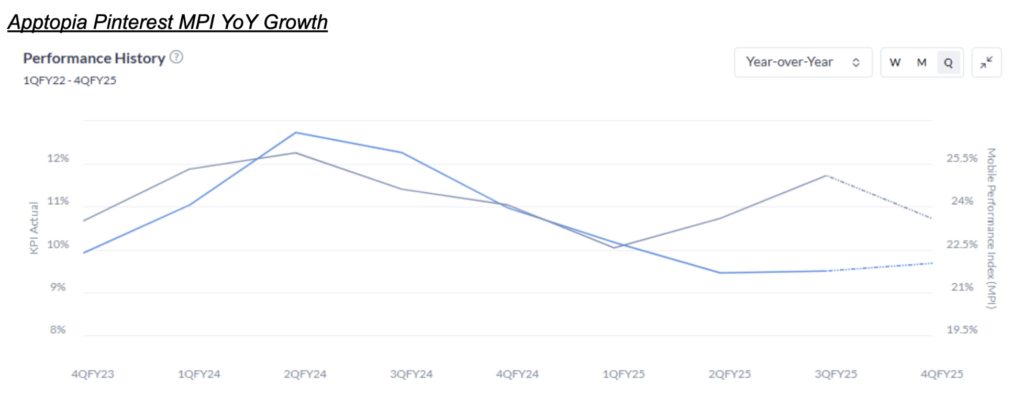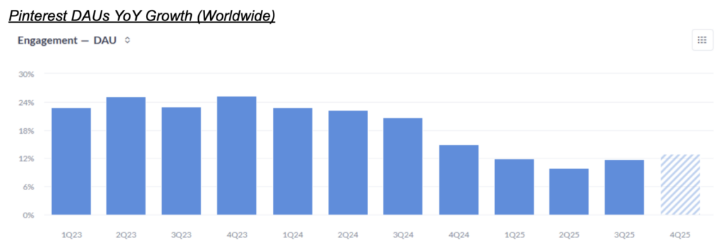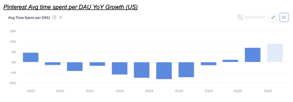 More interestingly, one thing social media apps target more than anything else is user engagement, and specifically time spent per user. Pinterest has seen the YoY growth of user time spent accelerate for the second quarter in a row so far in 4Q: