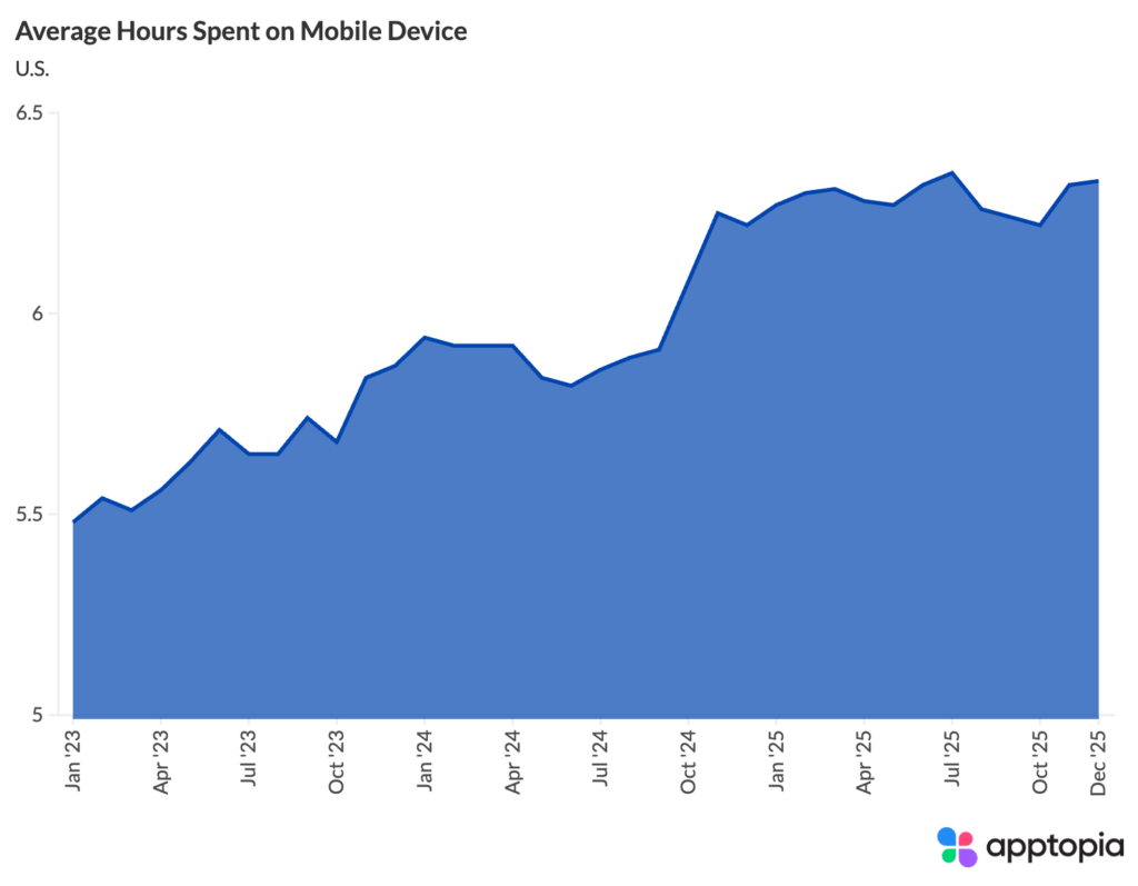 The average U.S. mobile user spent 5.5 hours per day on their phone in January 2023. By December 2025, that figure climbed to 6.3 hours, an increase of nearly 51 minutes per day, or about 15.6%. To put it differently, Americans are now spending roughly 190 hours per month on mobile. That’s more than a full-time work week every month, just on your phone. Although, it does feel weird to still be calling it a phone, doesn’t it?