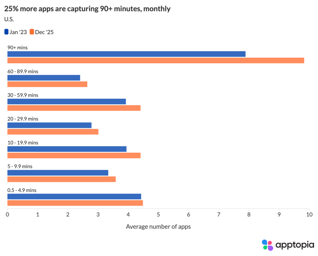 Looking at the distribution of how much time apps on a person’s device receive each month, the 90+ minute bucket grew the fastest, from about 8 apps per device in January 2023 to nearly 10 by December 2025. That’s a 24.6% increase. Meanwhile, light-touch apps receiving under 5 minutes per month barely budged, growing just 1.4%.