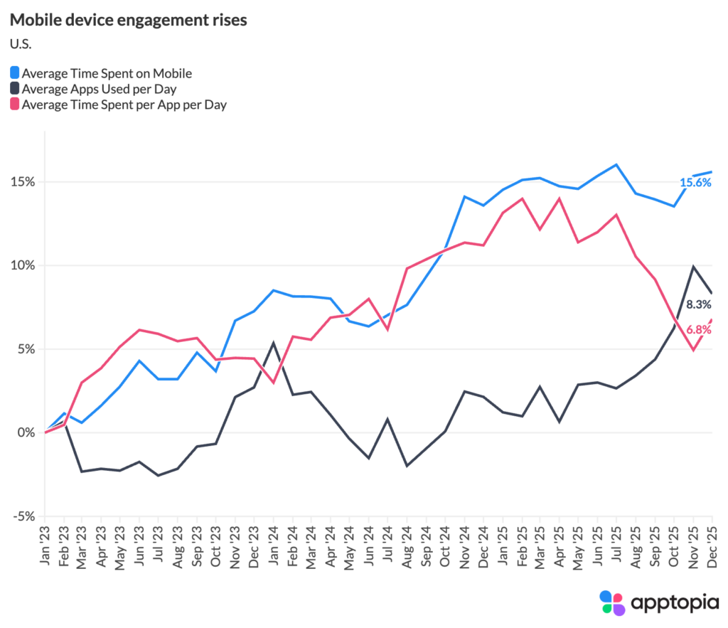 We took a look at Apptopia’s U.S. consumer panel data spanning January 2023 through December 2025 to understand high-level trends in mobile time spent, app usage and engagement depth. The big number is 6.3 hours per day. That is the average amount of time people are spending using their mobile phones each day. If you assume 8 hours of sleep each day, that’s 39% of the day devoted to being on your mobile device.