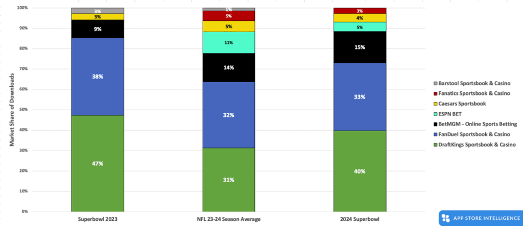 - DraftKings (DKNG) led all Online Sportsbooks in market share by new users on Super Bowl Sunday just as it did last year; meanwhile, FanDuel held the #1 spot all season.