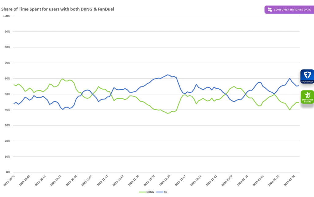 Market share by engagement was even during the Super Bowl, so we went a level deeper to see cross-app usage among devices in our panel that use both apps. Users of both FanDuel and DraftKings favored FanDuel during the Super Bowl (55% to 45%, respectively) and slightly during the season (51% to 49%, respectively).
