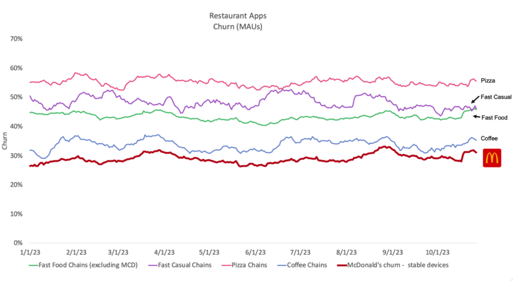 - McDonald’s: churn of ~30% is far lower than direct competitors in fast food, which average MAU churn of 43%.