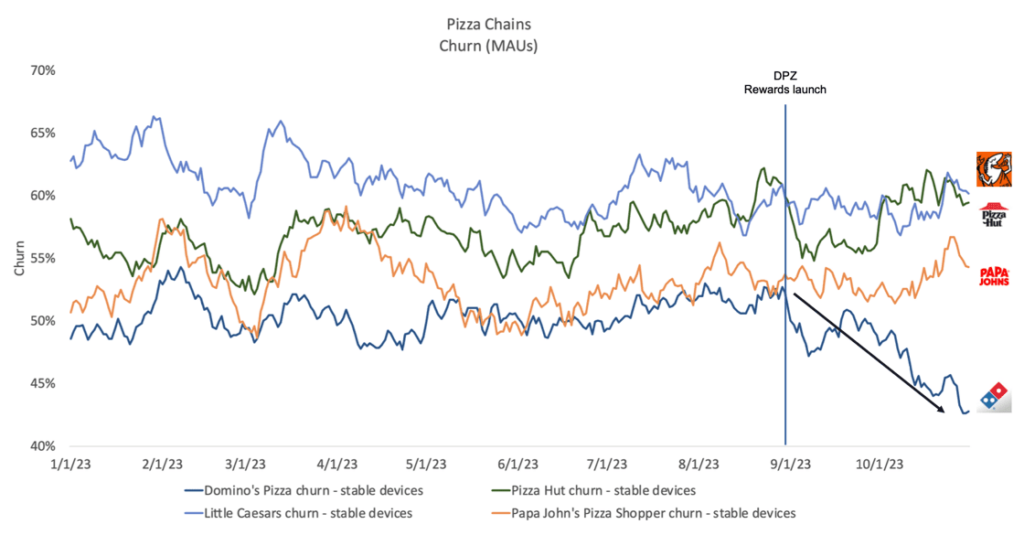 - Domino’s: churn averaged 46% in October, down -8pts Y/Y and the lowest of the pizza group. Domino’s fall in churn coincides with the launch of the new Domino’s Rewards program on 9/1/23.