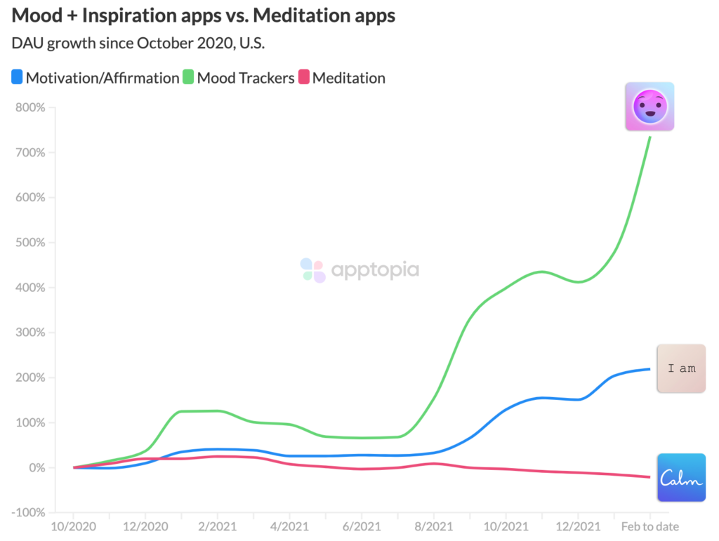 In fairness, the success of what I am calling emotional health apps were likely enabled by Calm and Headspace making ‘mental health care via meditation’ more mainstream. However, to see each app’s daily active usage take off due to innovative mobile features and design is a good reminder that mobile developers have the power to spark new consumer behavior. In the case of this new wave, those habits all feel positive.