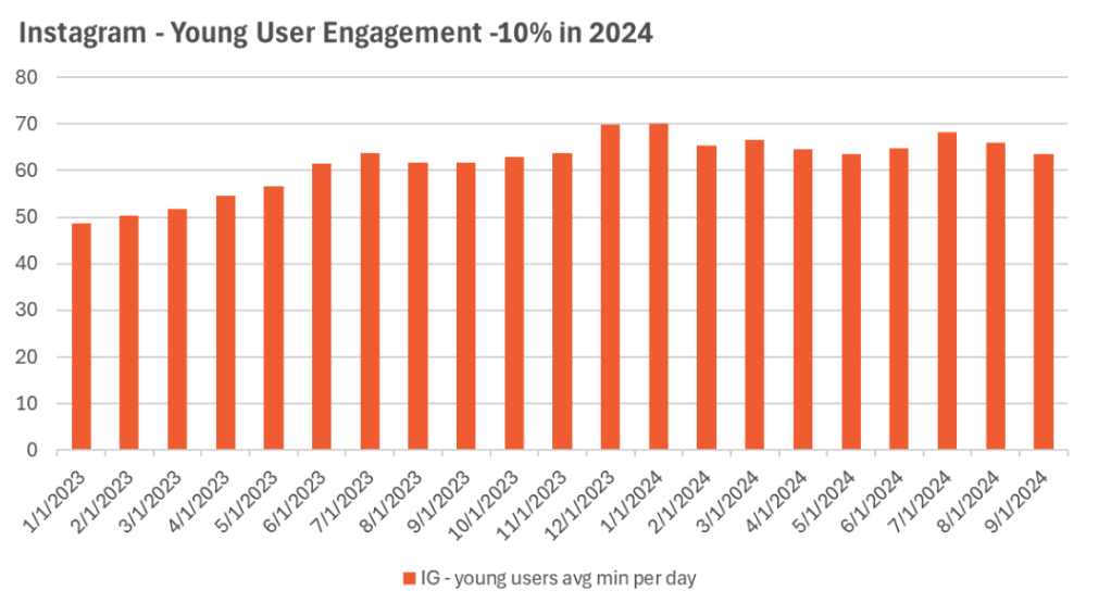 Trouble at Instagram. After a massive increase in user engagement in 2023, Instagram has seen weakening trends through most of 2024. Time spent by young users on Instagram rose from 49 minutes per day at the beginning of 2023 to 70 minutes per day at the end of 2023. This was driven by the truly impressive growth of Reels. However, young users have spent less and less time on Instagram in 2024, with minutes per day down -10% to 63 in September. While this is still an impressive amount of engagement, this trend is heading the wrong way.
