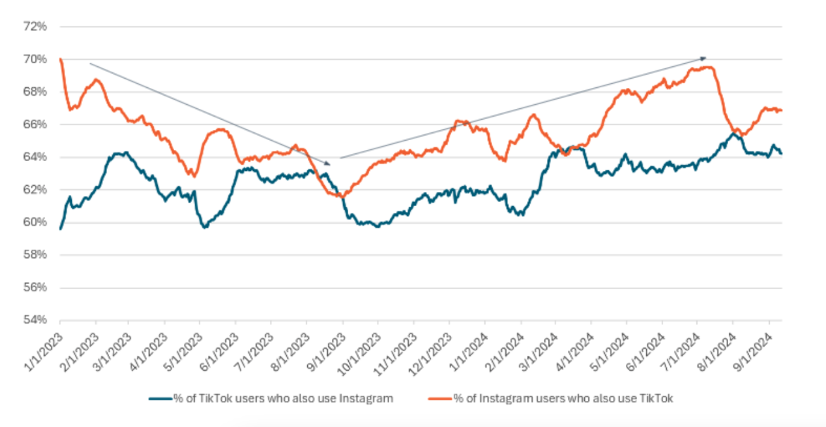 Instagram-TikTok Cross-App – Instagram Users Return to TikTok in 2024 (orange line)