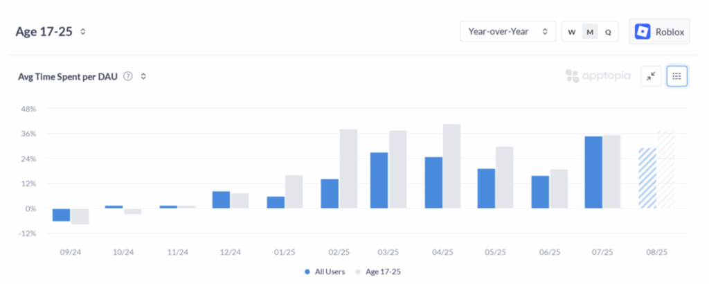 Roblox time spent per DAU for ages 17-25 – United States