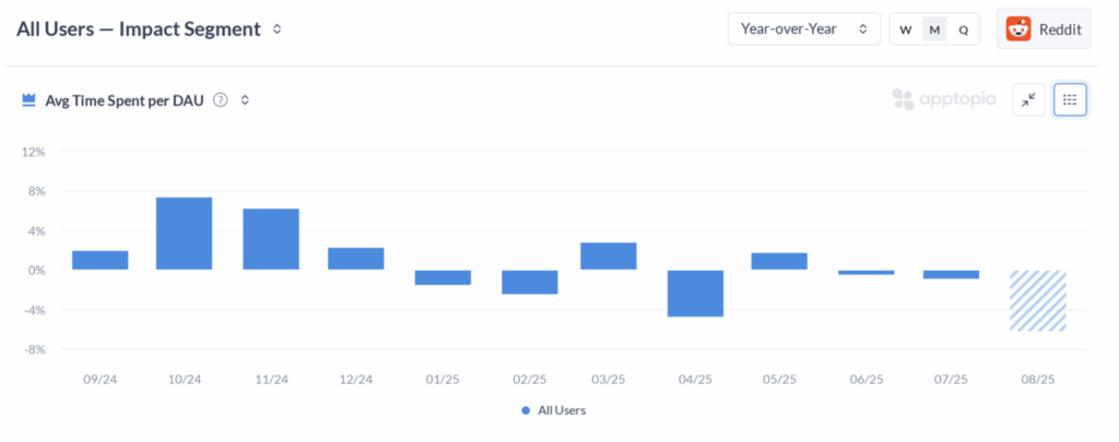 Reddit has slightly more controversy around it than HOOD and RBLX, which is reflected in YTD stock performance. App data remains fairly consistent – engagement in the US and growth globally for the app is not great. Reddit has found ways to offset it (or ChatGPT is offsetting this for them, however you want to look at it), but there are real reasons to be concerned about the app, which we are happy to discuss if you reach out to research@apptopia.com. Either way, the data is showing: 1) Worldwide, new user growth is negative year-over-year; and 2) time spent per user in the US is also falling YoY.
