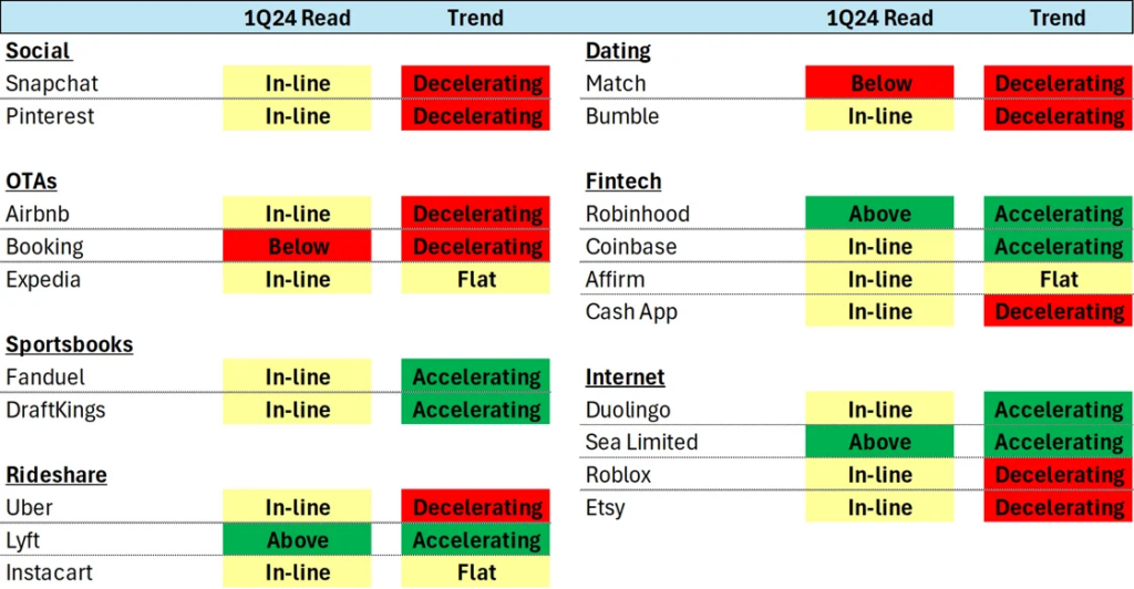 - Carvana (CVNA) – negative for most of year-to-date, downloads flipped positive to +4% YoY in April.