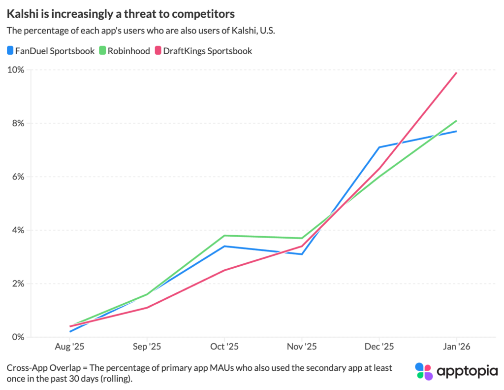 Apptopia’s consumer device panel is able to measure cross-app overlap, or the percentage of one app’s users who are also using another app. About 10% of DraftKings Sportsbook app users were also using Kalshi in January. The cross-app overlap between Kalshi and the major sportsbooks has been growing almost every month since August. The same goes for Robinhood.