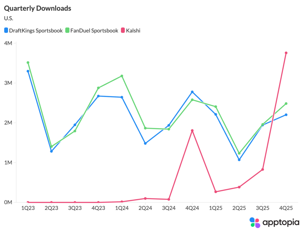 Perhaps the most striking data point in this analysis: Kalshi, a prediction markets platform that allows users to trade on real-world events including sports outcomes, recorded 3.76 million downloads in Q4 2025 — surpassing both DraftKings (2.2M) and FanDuel (2.5M) individually. This represents a 108% YoY increase from Kalshi’s Q4 2024 downloads of 1.8M.