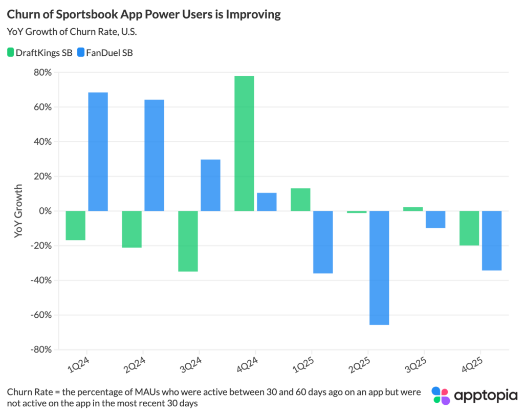Yet beneath the top-of-funnel slowdown lies a more nuanced story. Both DraftKings (NASDAQ: DKNG) and FanDuel (NYSE: FLUT) are seeing meaningful improvement in Power User retention. Power users represent the top 10% of users by time spent. These are the users who disproportionately drive revenue.