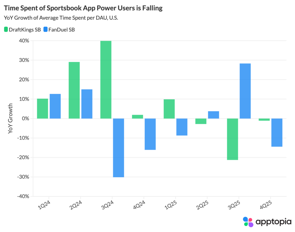 Average time spent per daily active user is a critical proxy for user stickiness. In Q4 2025, the two market leaders diverged meaningfully on this metric. DraftKings held engagement essentially flat YoY, with All Users averaging 31.8 minutes per day in Q4 2025 vs. 32.0 minutes in Q4 2024 (-0.9% YoY). Power Users averaged 174.6 minutes, also roughly flat (-1.1% YoY).