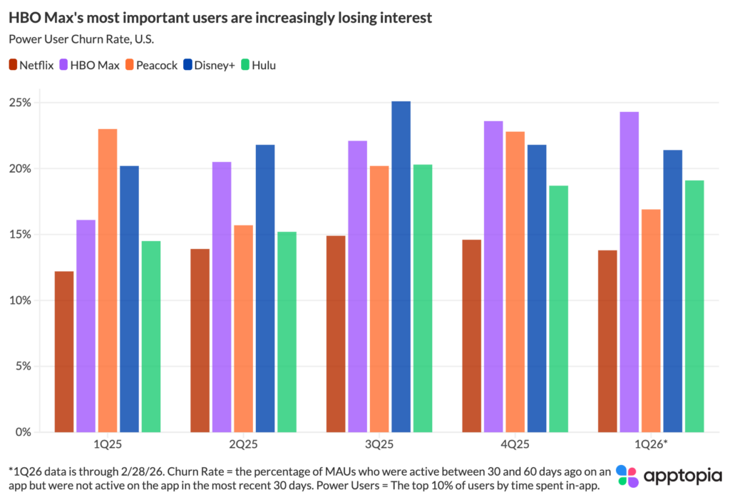 Peacock offers perhaps the most interesting Power User signal. Power Users represent the top 10% of users as judged by Time Spent. So far in Q1 2026, its Power User Churn Rate is at 16.9%, a 26.4% reduction, YoY. Peacock is the only app to show a YoY reduction in Power User Churn. The app is retaining its whales at rates approaching Netflix. Comcast co-CEO Mike Cavanagh’s recent declaration that “domestic is our path” for Peacock, paired with exclusive NBA and Olympic rights, could be paying off.