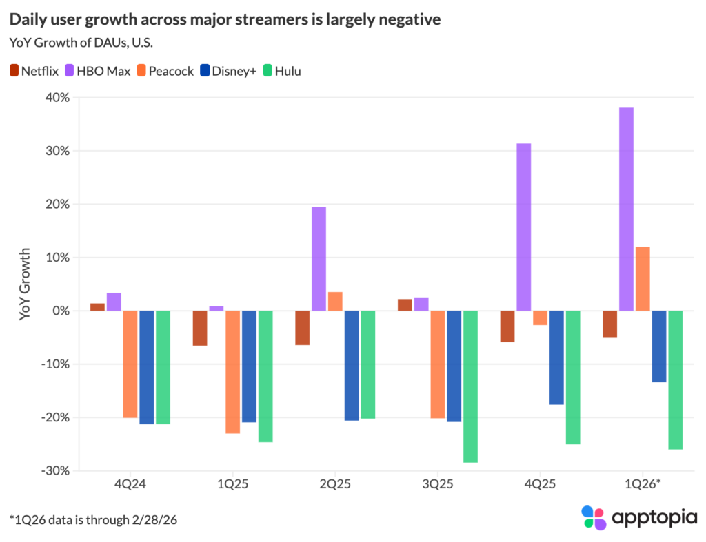 HBO Max’s mobile DAU growth stands alone. In Q1 2026 (through February), HBO Max DAUs are up +29.5% YoY, extending an acceleration that began in 2Q25. This is the only major streamer showing positive DAU growth over multiple consecutive quarters.