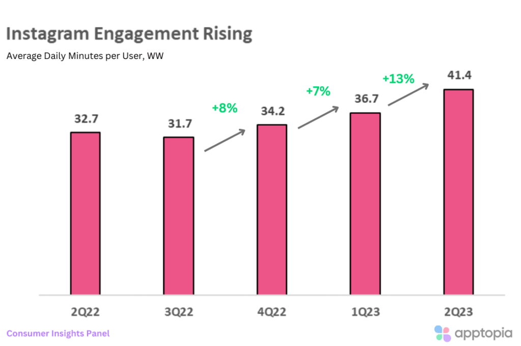- Average daily minutes per Instagram user has had positive QoQ growth since 4Q22 and increased sequentially QoQ in Q2 (+7% in Q1, +13% in Q2).
