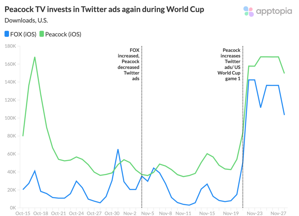 Ironically, the peaks and valleys of both apps’ daily downloads look similar in the first half of November despite reverse strategies. We can only assume that Peacock TV interpreted a signal in its own performance – or saw Elon Musk’s tweet about World Cup coverage on Twitter – to inform its decision to invest on the Twitter network again.