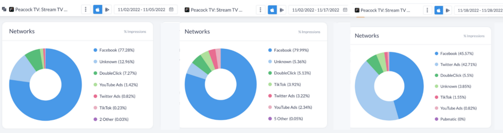 Notably, two of the leading Streaming apps for World Cup viewers, FOX Sports and Peacock TV, increased Twitter ads targeting iOS users in November. FOX Sports went from Twitter ads representing 9% of all iOS ads in October to 63% in November, and the initial increase in allocation toward the Ad Network match the days that Elon Musk assumed position as CEO.