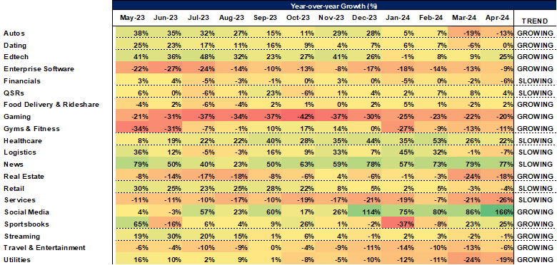 Round up of additional trends – Sportsbook apps trended positively in April (+25% YoY), Dating apps bounced back to flat YoY after falling in March, and EdTech apps spiked to +25% YoY led by Duolingo.
