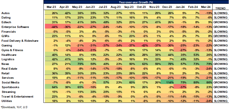 - Real estate/Autos fall – real estate search portal apps fell to -24% YoY and autos/auto dealers fell to -19% YoY, both slowing significantly in March.