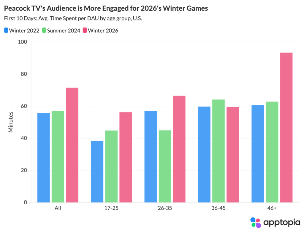 “Comcast has been explicit that live sports, e.g. the Olympics, NBA, and the Super Bowl, are the engine it is betting on to drive Peacock’s subscriber growth,” said Tom Grant, VP of Research at Apptopia. “But subscriber counts only tell part of the story. What our data shows is that the Winter Games are functioning as more than an acquisition event. Roughly a quarter of Peacock’s Olympic audience were churned users who came back. Another quarter had never opened the app at all. The critical question now is how many of those resurrected and new users are still there when the torch goes out.”