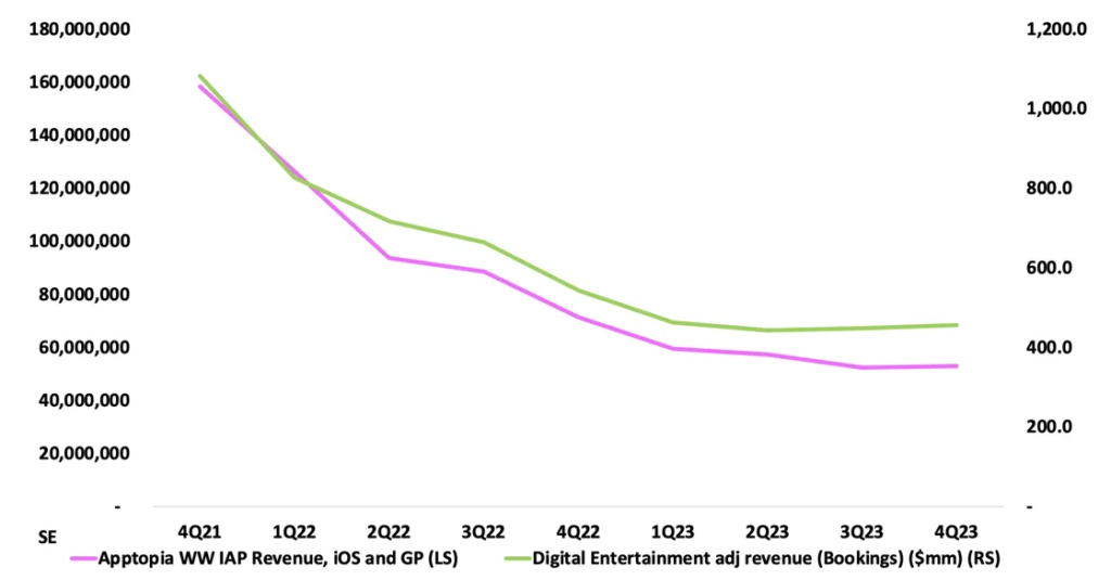 - Apptopia estimated IAP Revenue for Sea Limited (SE) Garena Free Fire stabilized in 4Q, up 1% sequentially over 3Q23. Year-over-year growth also was less negative at -26%.