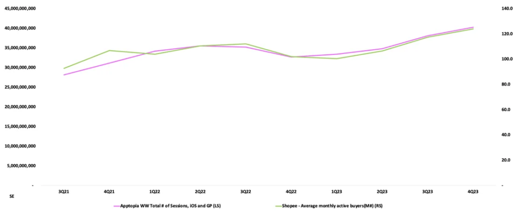 Sea Limited also announced that they achieved profitability in 2023 and strengthened market leadership for the company’s e-commerce business, despite intensified competition in Southeast Asia. Our mobile correlation data shows that in 4Q23, there was a three-year correlation of 0.95 between Shopee monthly active buyers and Apptopia total sessions. Additionally, YoY growth is up 23%, indicating Shopee’s solidification of their market share into 2024.