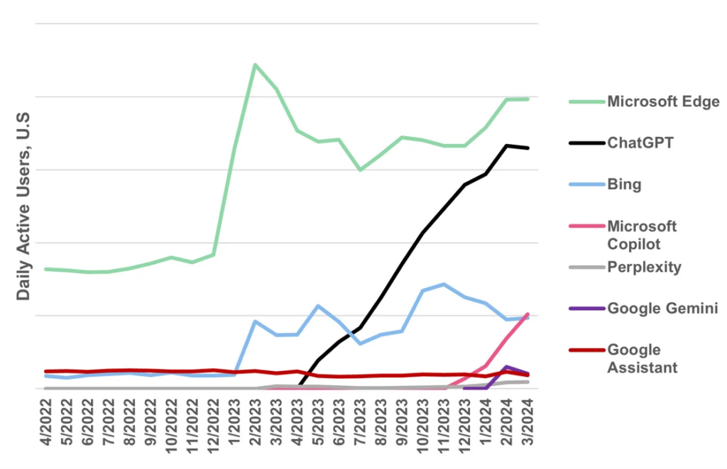 ChatGPT is a clear winner and continues to see user adoption. Users have trended up since launch, separating from Microsoft’s apps Edge & Bing which have seen choppier growth. Microsoft Copilot also appears to be a winner – with strong growth since its launch in November and users now surpassing Microsoft Bing.