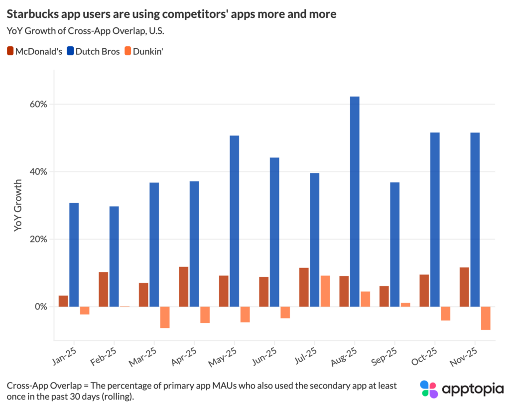 - Starbucks app users are increasingly using Dutch Bros and McDonald’s.