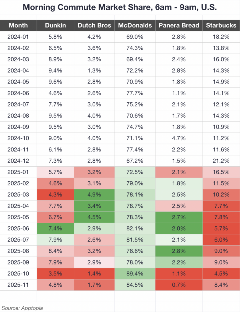 Let’s zoom in to the daily habit and look at the all-important 6am-9am window for morning coffee and breakfast. Market share for Starbucks has dropped from 18.2% in January 2024 to just 8.4% in November 2025. Dutch Bros, Dunkin’, and Panera Bread have all also lost share.