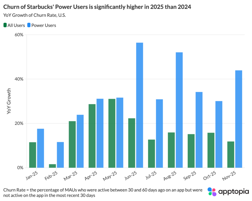 - Power User Churn is up an average of 33% this year for Starbucks.