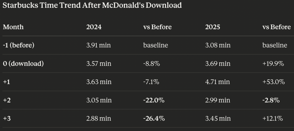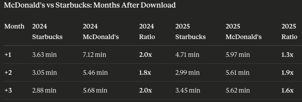 While time did decrease on Starbucks in 2024 after downloading McDonald’s, it actually increased in 2025. However, in both years, Starbucks users ended up spending more time in the McDonald’s app than they were in the Starbucks app. It seems it is providing more value to them as a consumer.