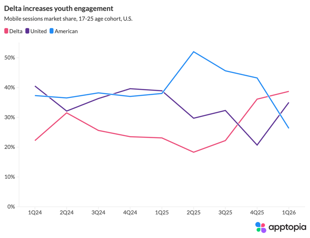 “The Delta move in the 17–25 cohort is worth watching,” said Tom Grant, VP Research at Apptopia. “Young travelers may be picking a loyalty program, not just a flight. If Delta is gaining that cohort at American’s expense, the compounding effect on SkyMiles enrollment and lifetime revenue could show up in the financials two or three years from now. The 46+ rotation from United to American is the other thread to pull on because those are the premium cabin buyers. When leadership changes hands there and holds for three consecutive quarters, that’s a signal.”
