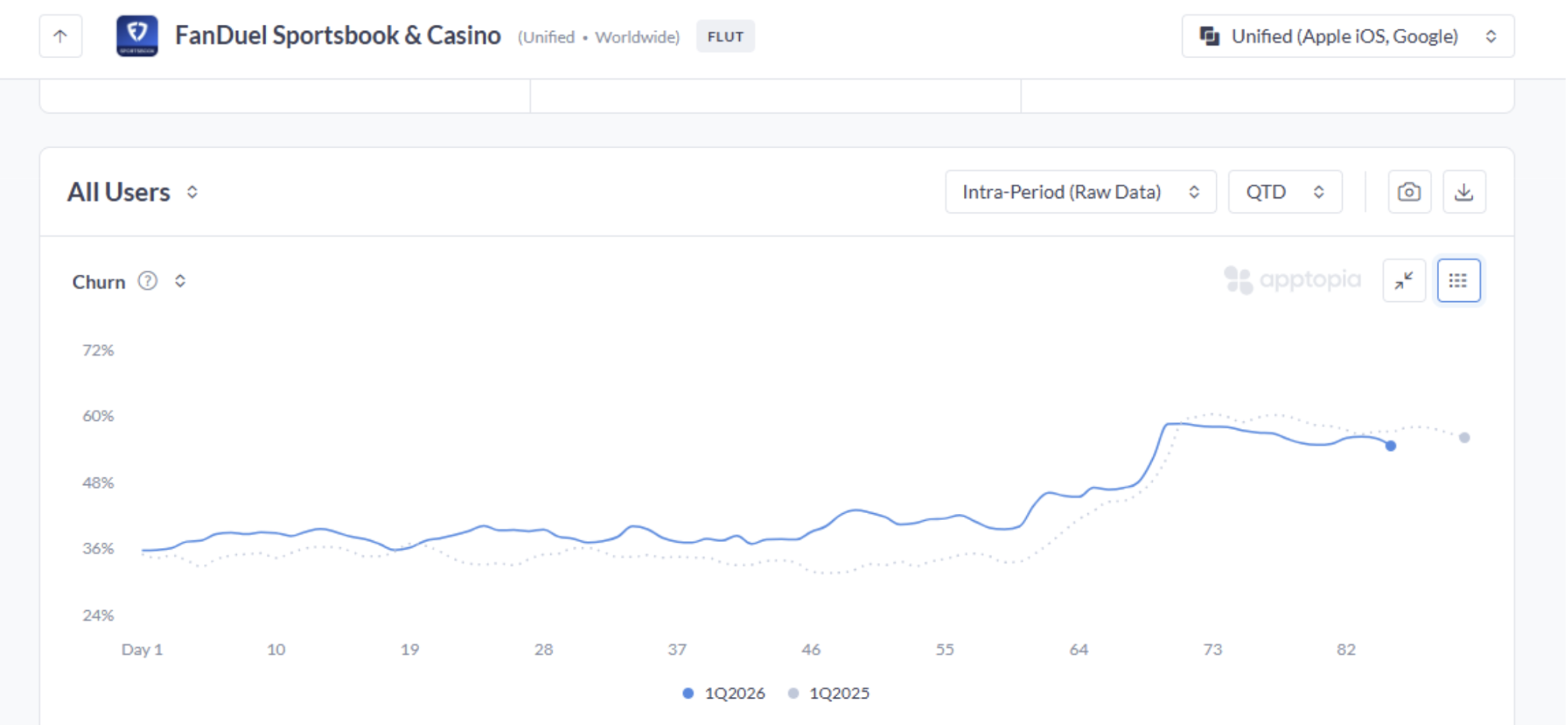 DAU followed at 67.0% WoW and 15.3% YoY. But churn at FanDuel climbed 17.9% YoY, raising the question of whether the event-driven surge is converting into retained users. Here’s what Apptopia’s mobile signals are showing for FLUT.