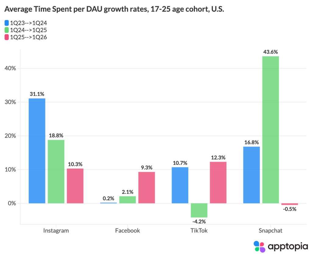 Comparing Q1 2025 to Q1 2026, Instagram [NASDAQ: META] grew Average Time Spent per DAU by 9.8%. Facebook grew 10.3%. TikTok grew 6.7%. Snapchat [NYSE: SNAP] declined 2.5%.