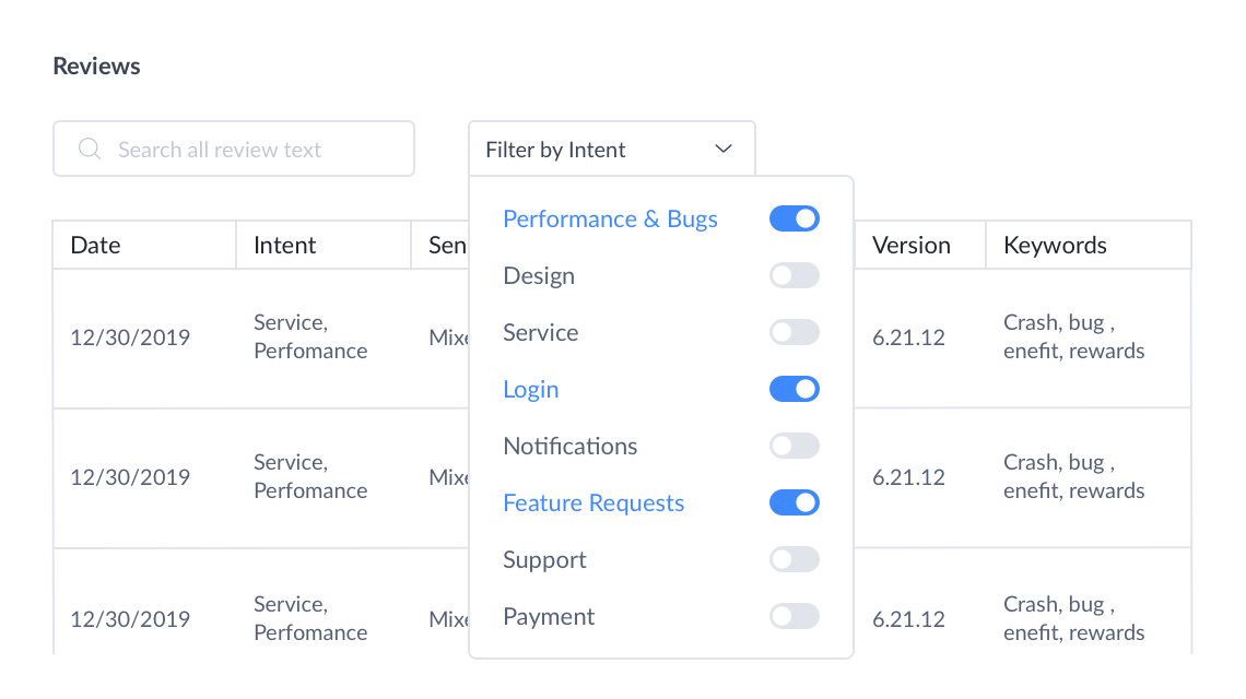 Don’t let a “good” star rating fool you, the devil is in the details (text). Use Intent to filter down reviews to find actionable insights on issues which could be affecting user retention in your apps or your competitors apps.